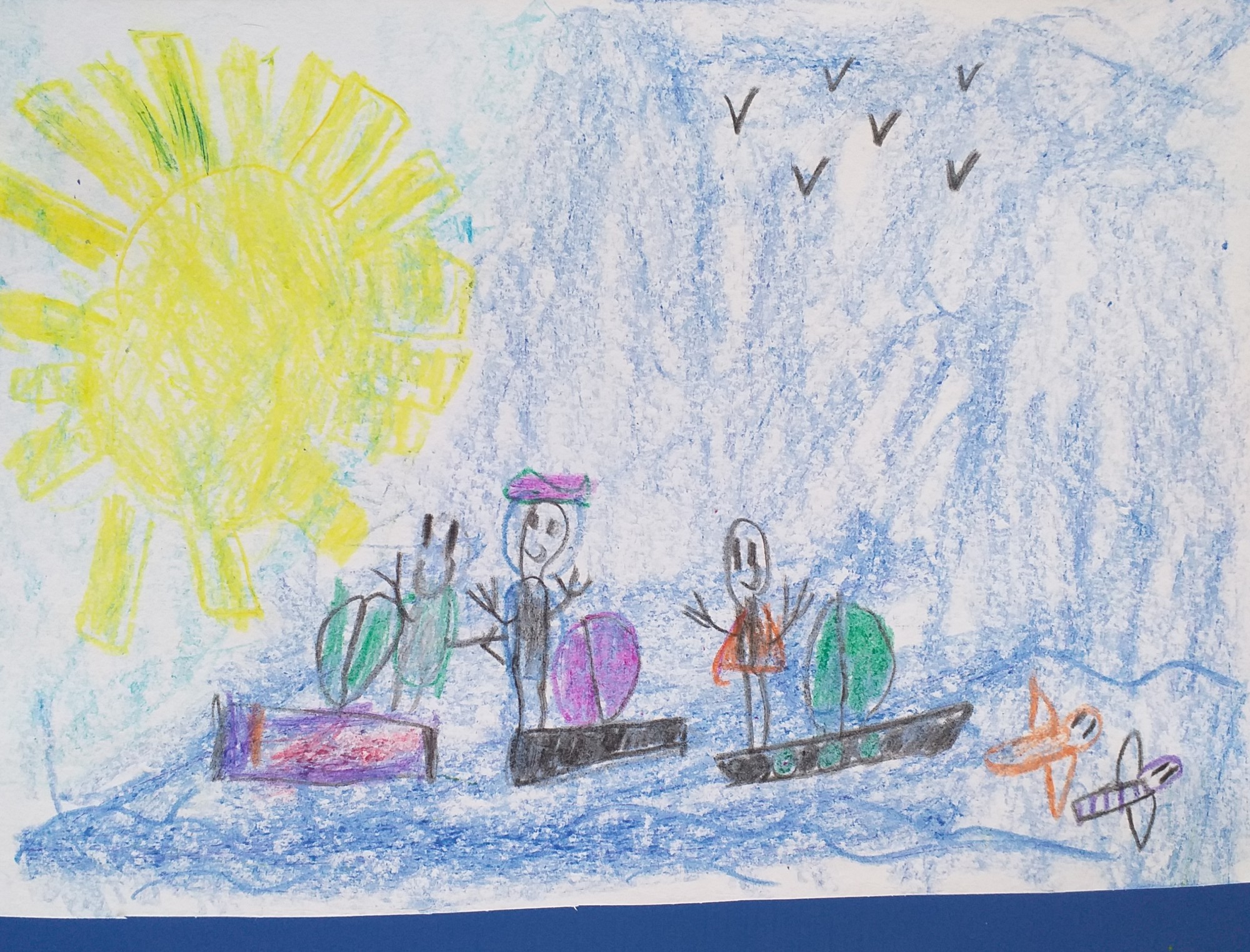 Zēns izmantoja vaska krītiņus. Viņš sapņo doties ceļojumā kopā ar draugiem laivās