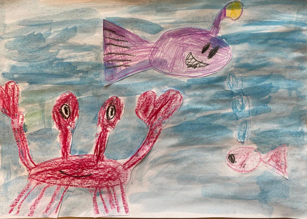 Visi dzīvo ūdenī un draudzējas. Lielā zivs ar krabi priecājas par burbuļiem.