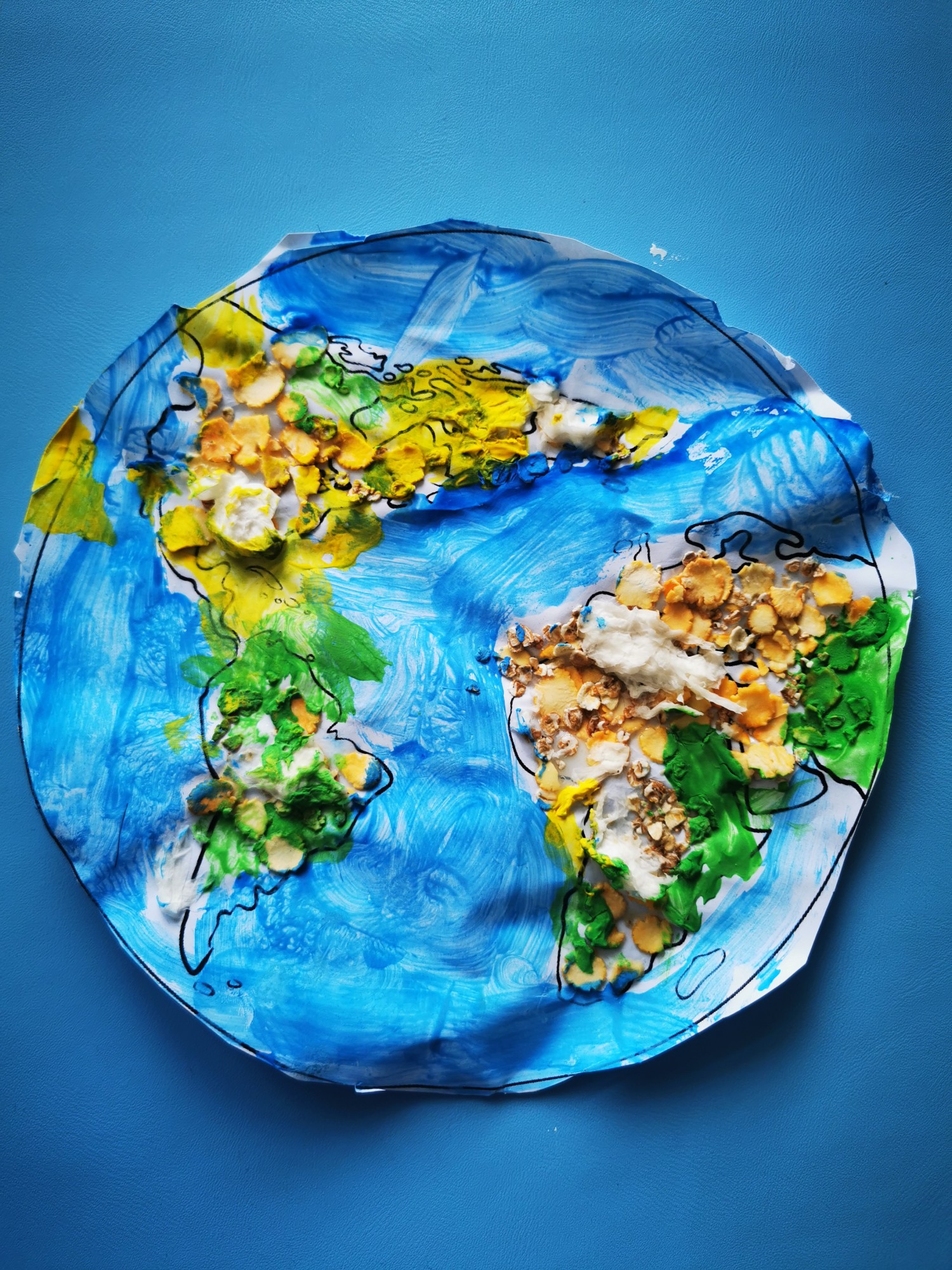 Pasauli izveidojām dažādās tehnikās, no sākuma iekrāsojām zilos ūdeņus, brokastu pārslas bija kalni, zaļā krāsā iekrāsojām savu cilvēces bagātību- mežus.