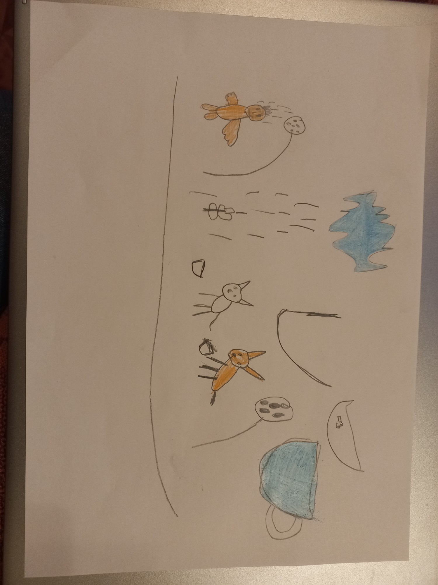 Uzzīmēju krūzīti, tur ūdens iekšā. Mākonī lietus, līst uz puķītes. Kaķītim bļodiņa, tur barība, ūdens arī. Putniņš mazgājas dušā.