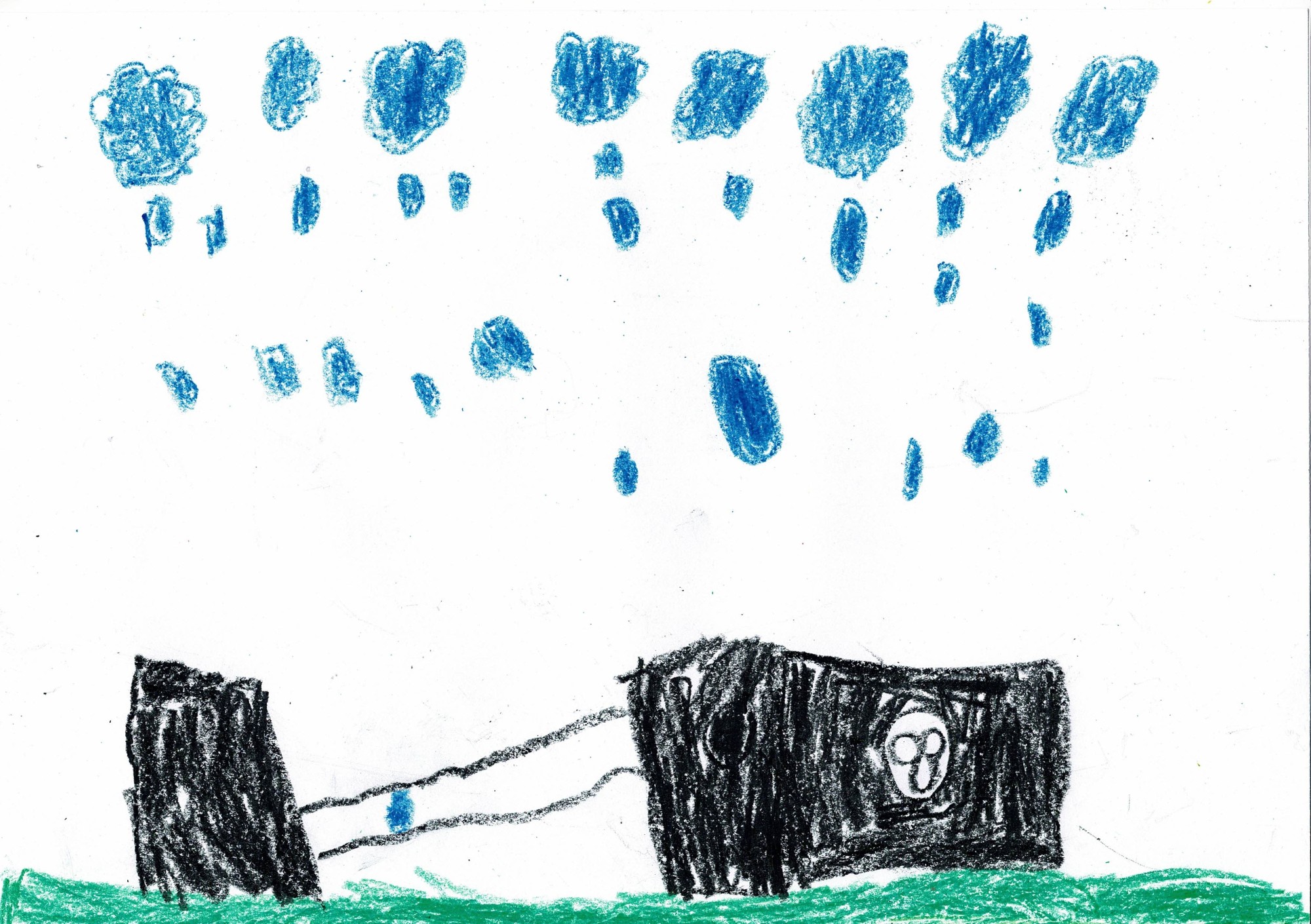 Zīmējumā tiek attēlota ūdens pilīte, kura nokrīt uz zemes un tiek pārstrādāta, piemēram, attīrīta un padota tālāk cilvēkiem uz mājām.