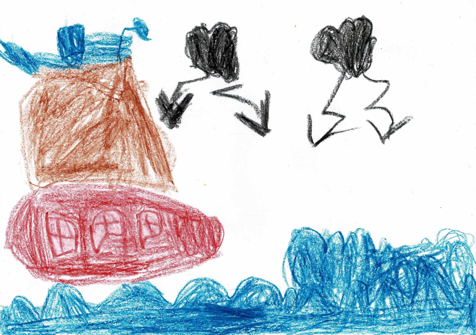 Zīmējumā ataino kuģa pārvietošanos pa ūdeni jeb loģistiku. Kuģis pārvadā pa ūdeni dažāduspārtikas produktus